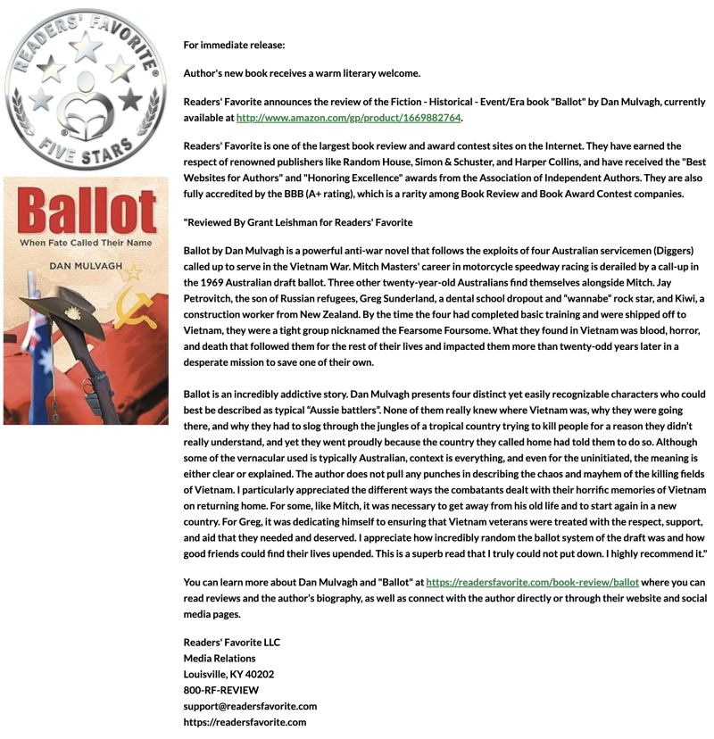 "Your book 'Ballot' deserves extraordinary praise, and we are proud to acknowledge your hard work, dedication, and writing talent. Start telling the world that you're an award-winning author because we will be!" Thomas Anderson, Editor in Chief, Literary Titan